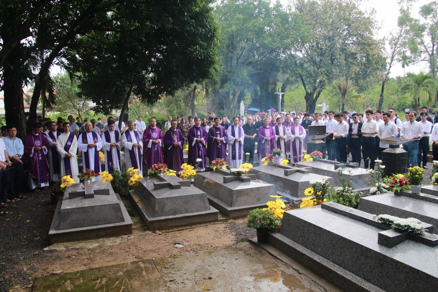 Trong Hiến Pháp Dòng Tên (HP), Thánh Inhã nhắc nhở các Giêsu hữu phải cầu nguyện cho các anh em đã qua đời bằng “những lời cầu nguyện rất đặc biệt” [HP số 596] để “đức mến được bày tỏ trong Chúa đối với người chết cũng không kém đối với người sống” [HP số 598-601]. Trong tâm tình ấy, sáng Chúa Nhật, ngày 02/11/2025, tại nghĩa trang Đan viện Biển Đức Thiên Bình (Biên Hòa - Đồng Nai), quý cha, quý thầy học viên, các em Tập sinh và Ứng sinh Tỉnh Dòng Tên Việt Nam đã quy tụ bên cha Phanxicô Xaviê Nguyễn Hai Tính, S.J., - Giám đốc SJJS, đại diện cha Giám Tỉnh - để cùng dâng Thánh lễ cầu nguyện cách đặc biệt cho các Giêsu hữu đã qua đời tại Việt Nam. Hiệp thông trong Thánh lễ còn có quý tu sĩ nam nữ, quý ân thân nhân, bạn hữu và các cộng tác viên của Dòng.
